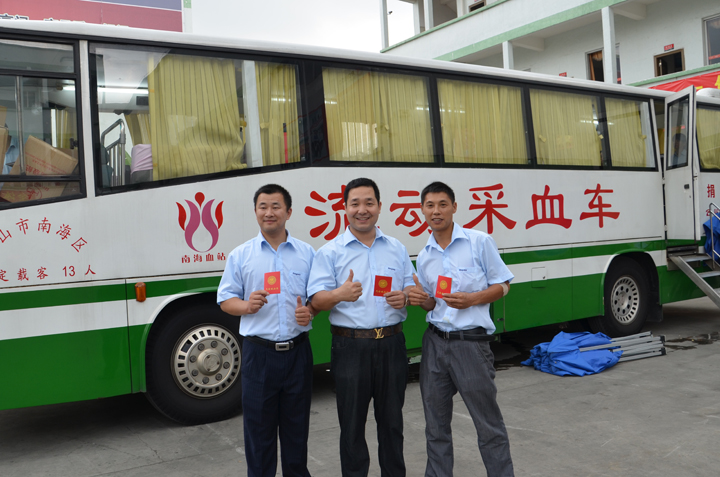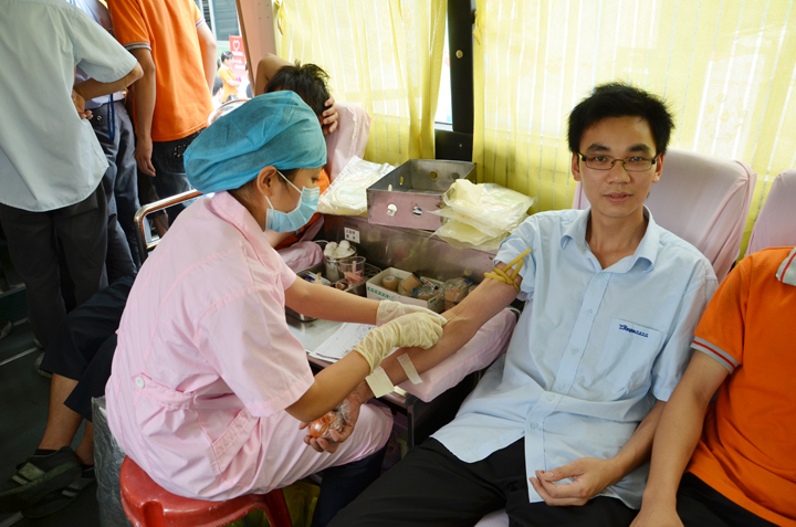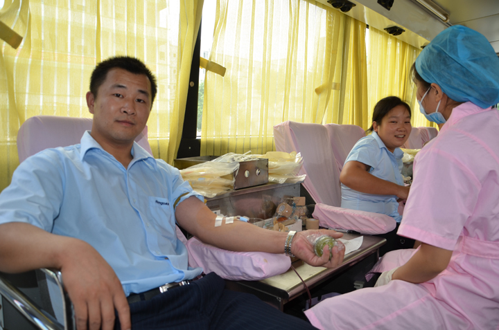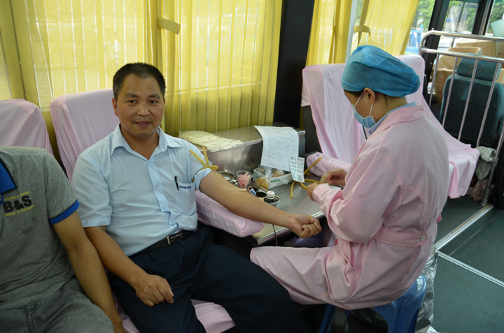 研發(fā)部經(jīng)理陳壯在獻(xiàn)血車上獻(xiàn)血